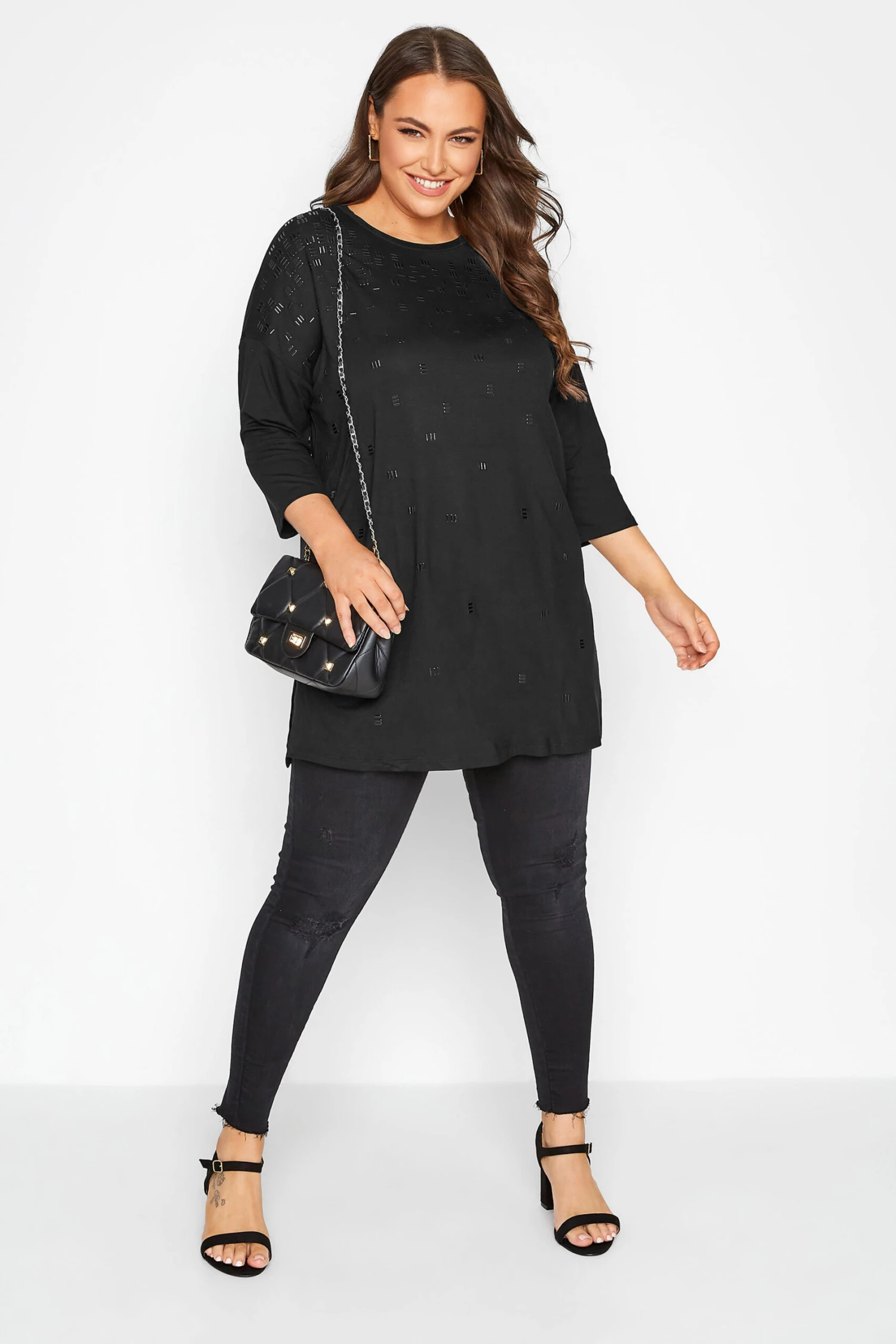 Meet your new favourite t-shirt! Made from soft jersey, it features 3/4 length sleeves and a scoop neckline with side splits, complete with stud details. Style with leather leggings and boots for a shopping day with the girls.