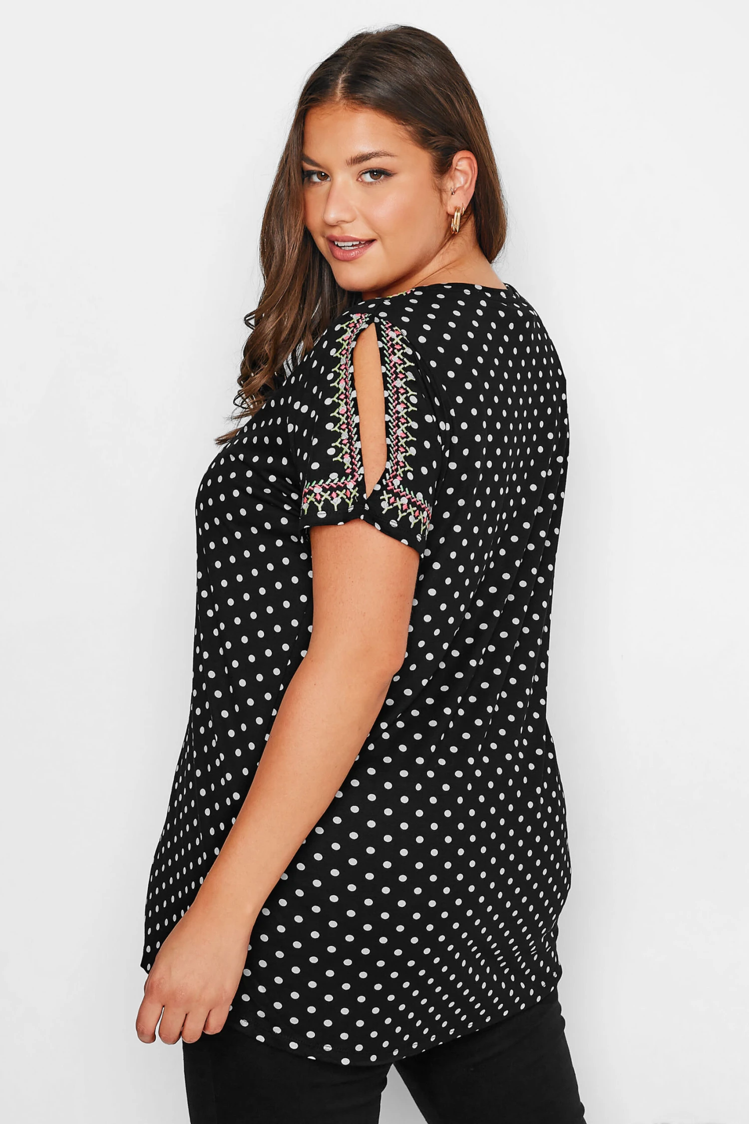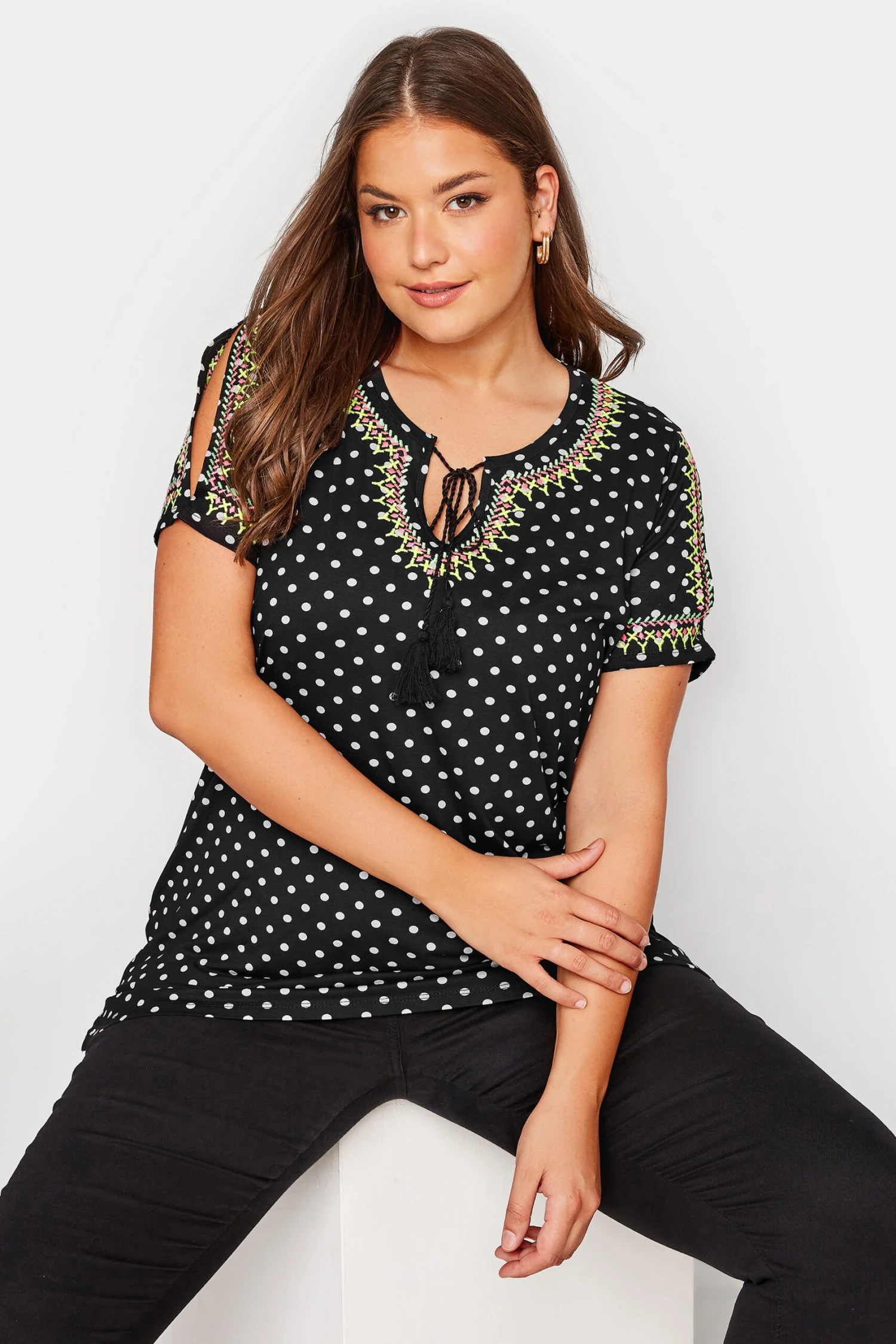 Meet your new favourite top. Made from a soft jersey fabric, this plus size top features embroidered details and a notch neckline with a fringe tie, complete with short sleeves. Compliment with jeans and sandals for an easy weekend look you can rely on.