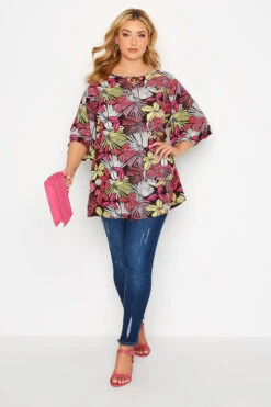 Add something different to your tops collection with this plus size t-shirt. Comfortable in jersey, it features a tropical print and notch neckline with a tie detail and 3/4 length sleeves. Team with denim and trainers for an easy casual look.