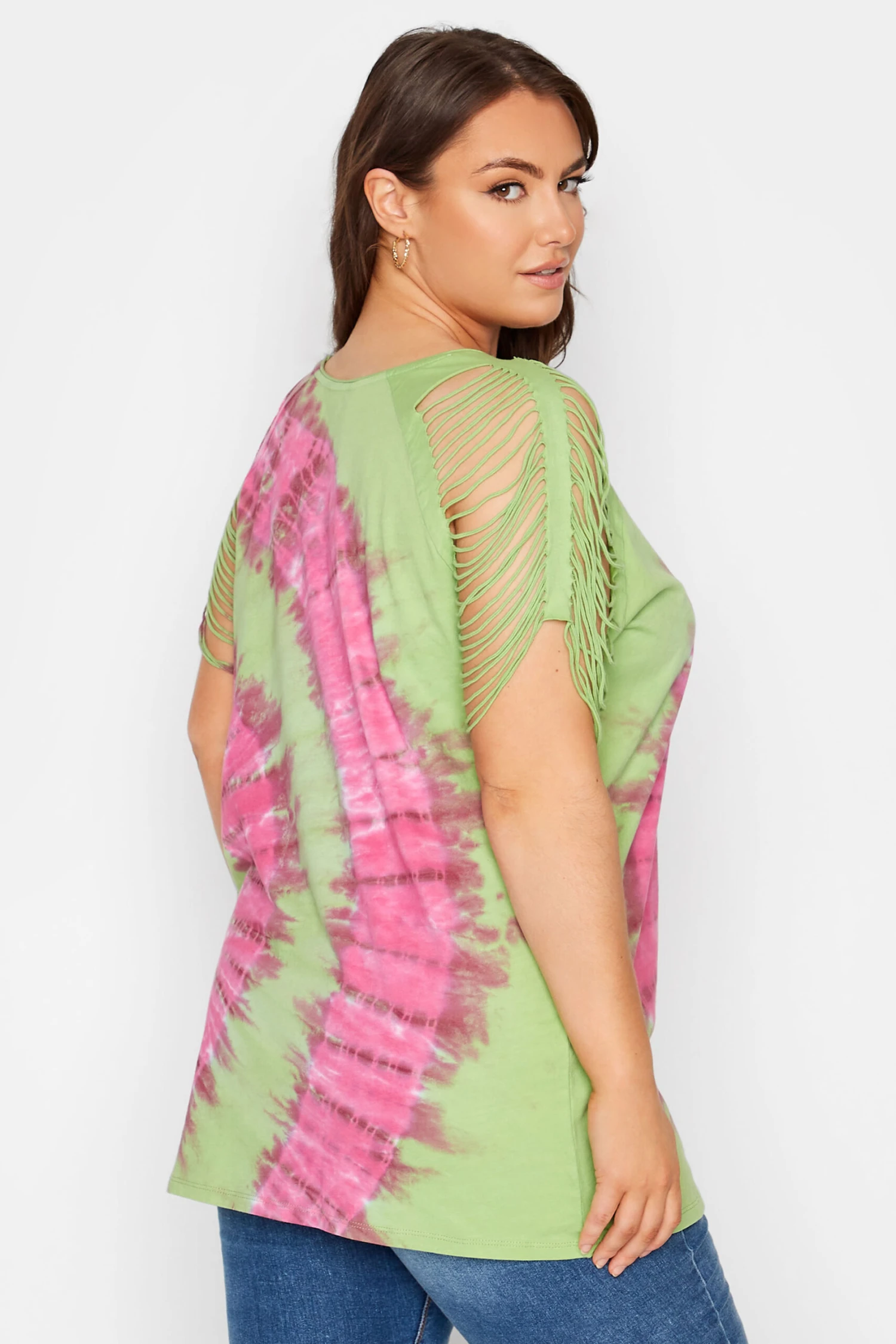 Add a touch of edge to your casual collection with this new-in top. Made from a soft cotton fabric, it features a green and pink tie dye print with short sleeves and shredded detail to the arms. Complete the look with jeans and trainers for easy off-duty appeal.