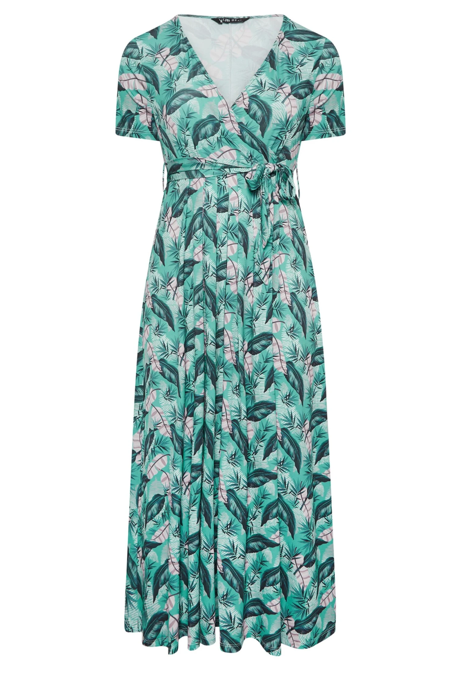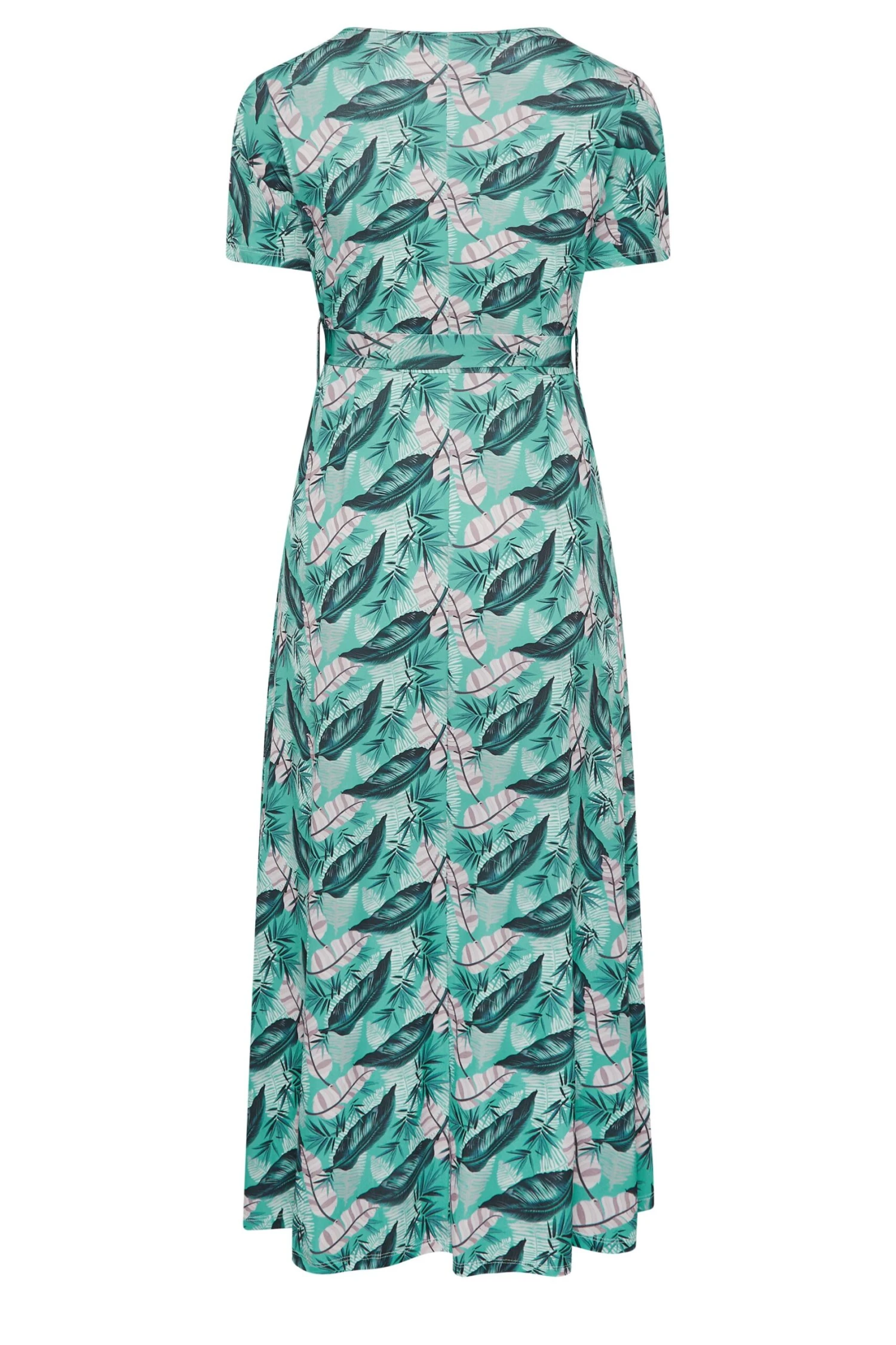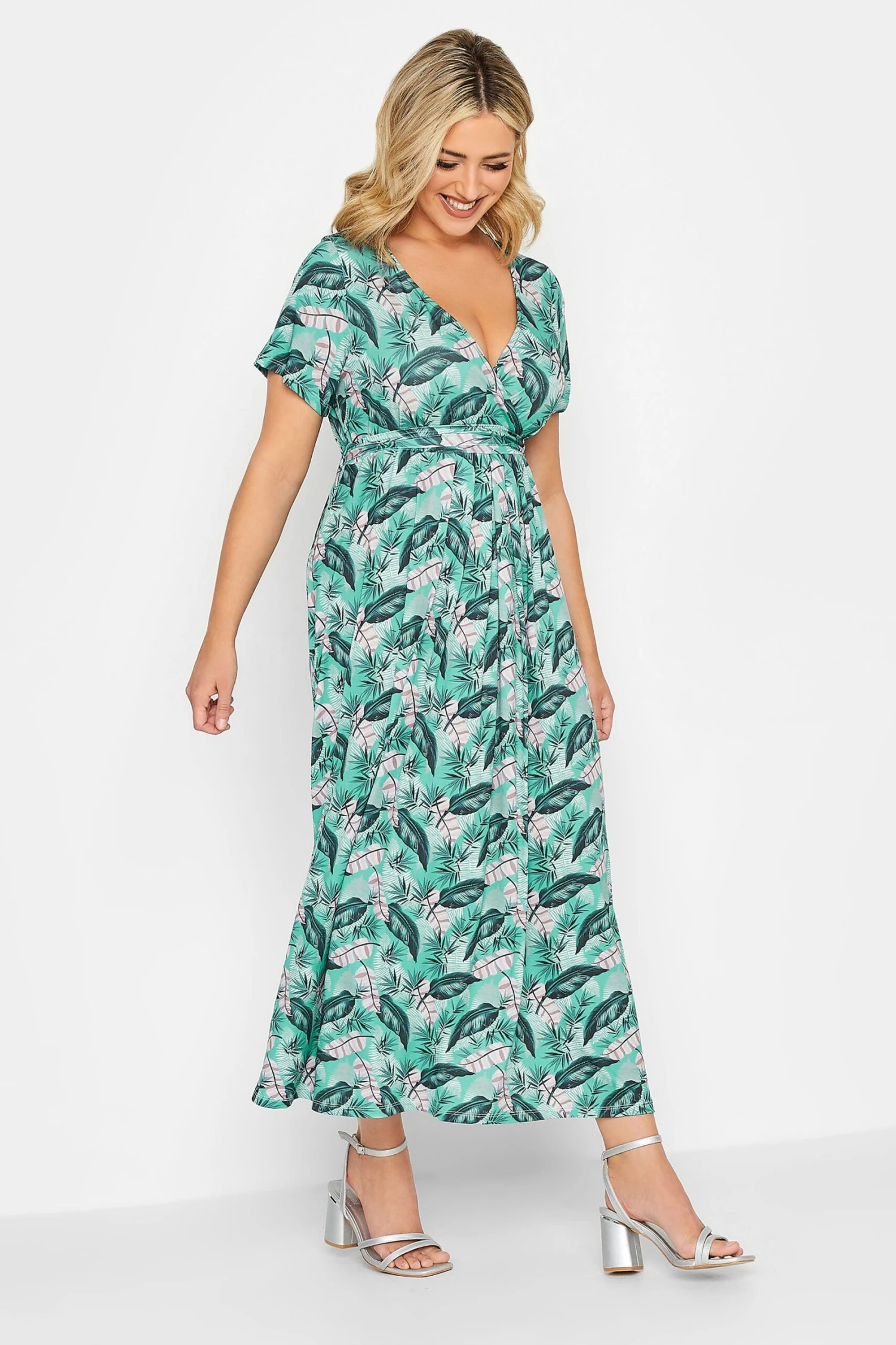 Heighten your wardrobe with this new-in maxi dress. Made from a comfortable jersey fabric this dress features a leaf print, a v-neckline, a tie waist, and short sleeves. Style with heels for a look you can wear with confidence.