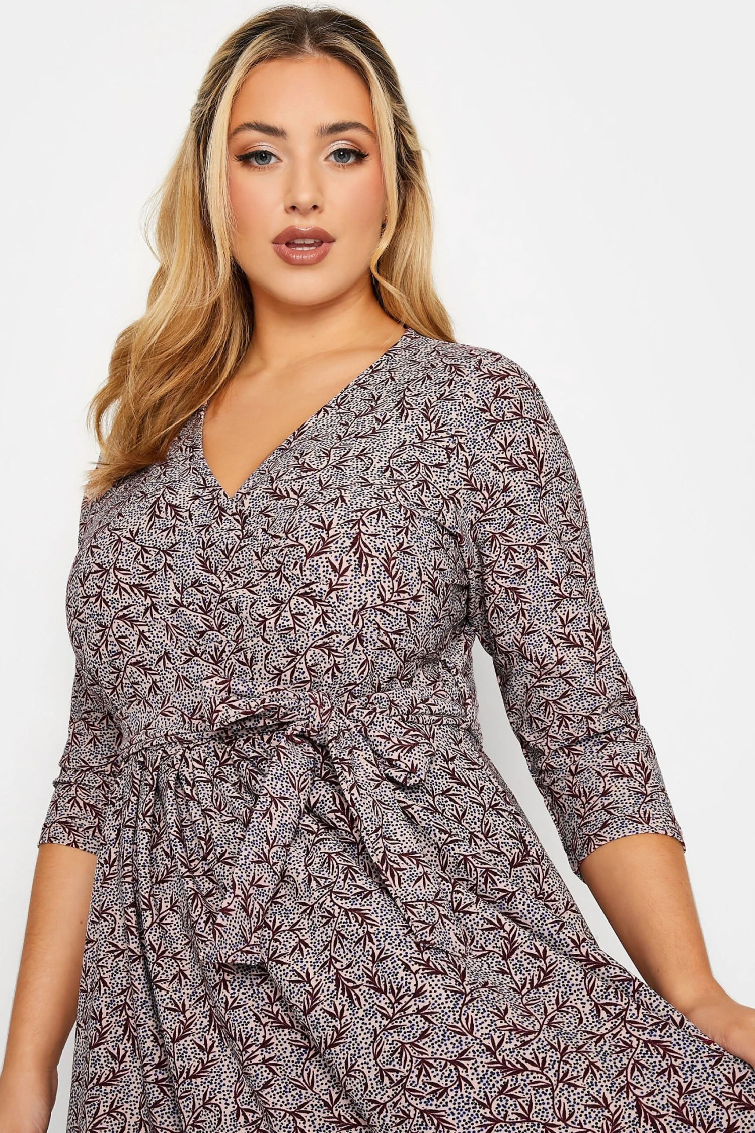 No wardrobe is complete without this plus size wedding guest dress. Made from a comfortable jersey fabric, this dress features a leaf print, a v-neckline, a maxi length, 3/4 length sleeves, and a wrap style finished in a tie waist.