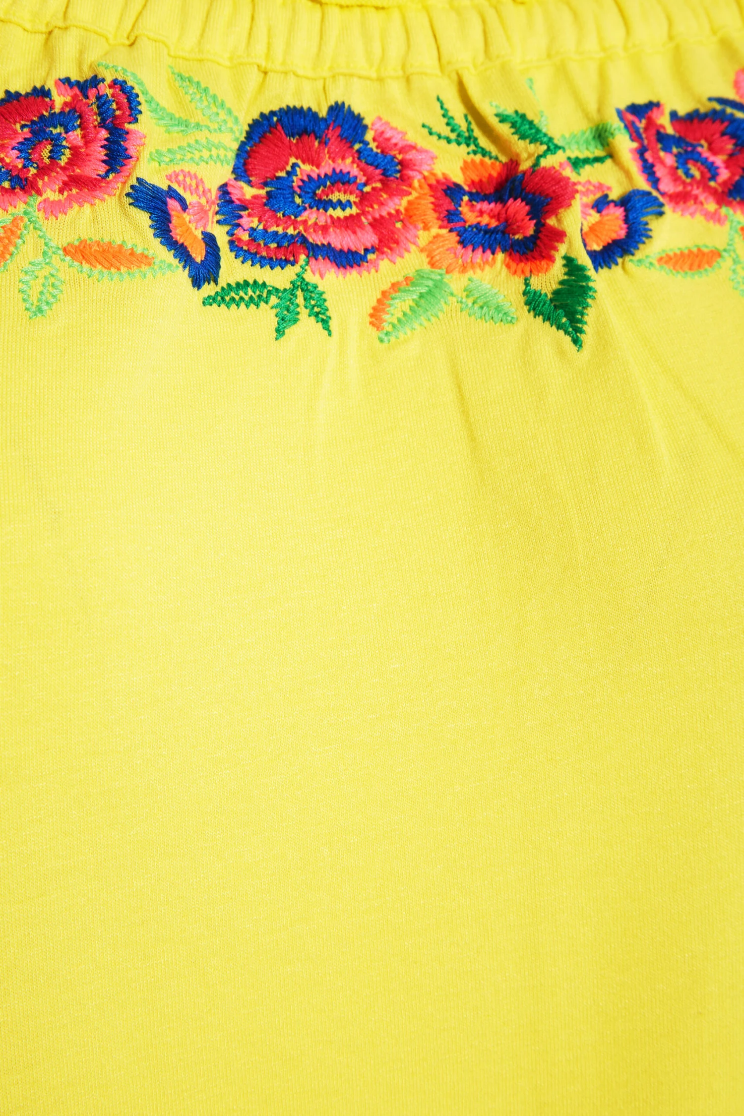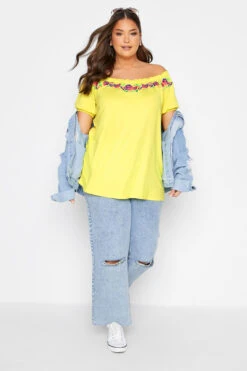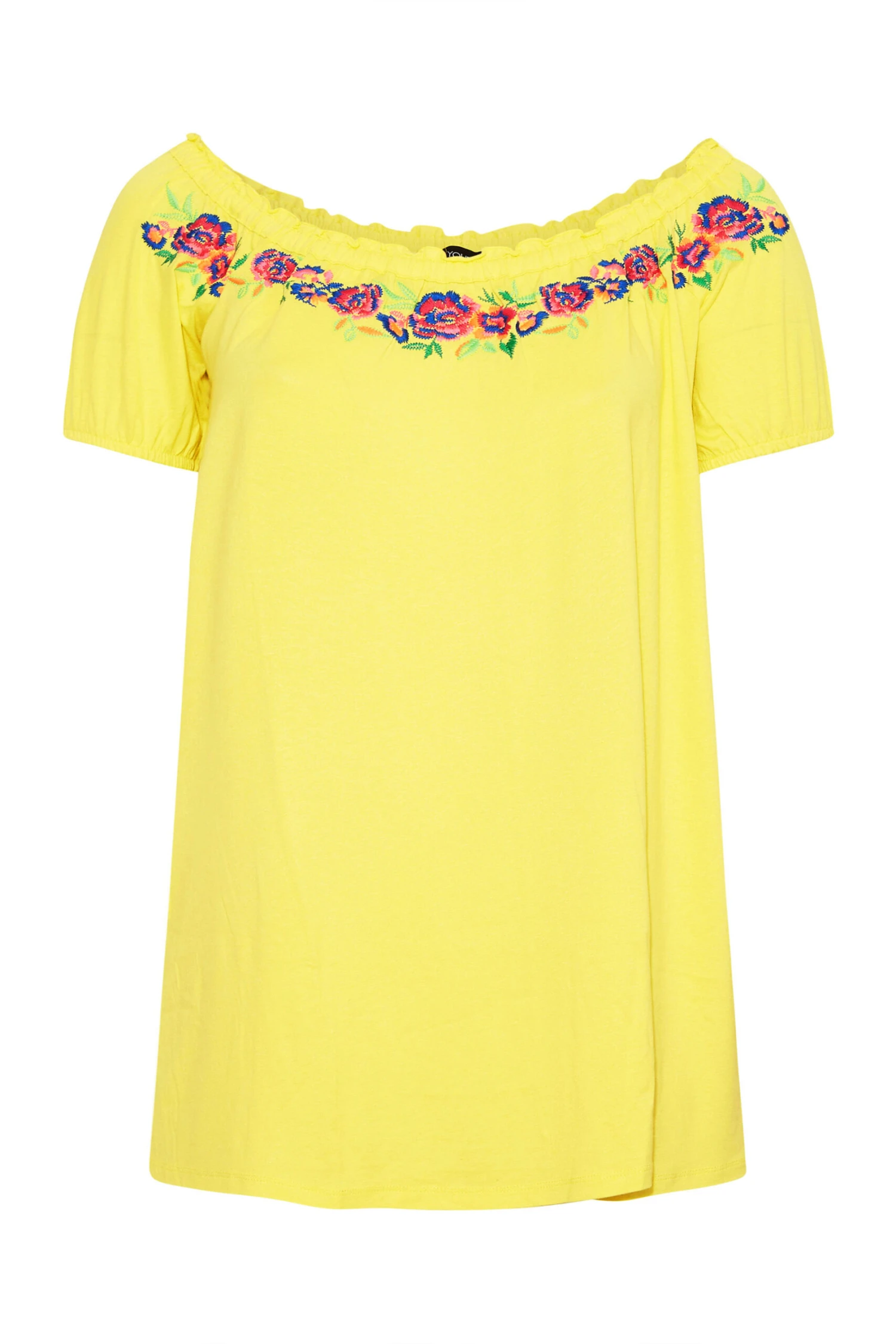 Update your T-shirt collection with this floral embroidered top. Made from a soft jersey fabric, it features a bardot neckline and short puffed sleeves. Pair with your favourite denim jeans and trainers for an casual, everyday look.