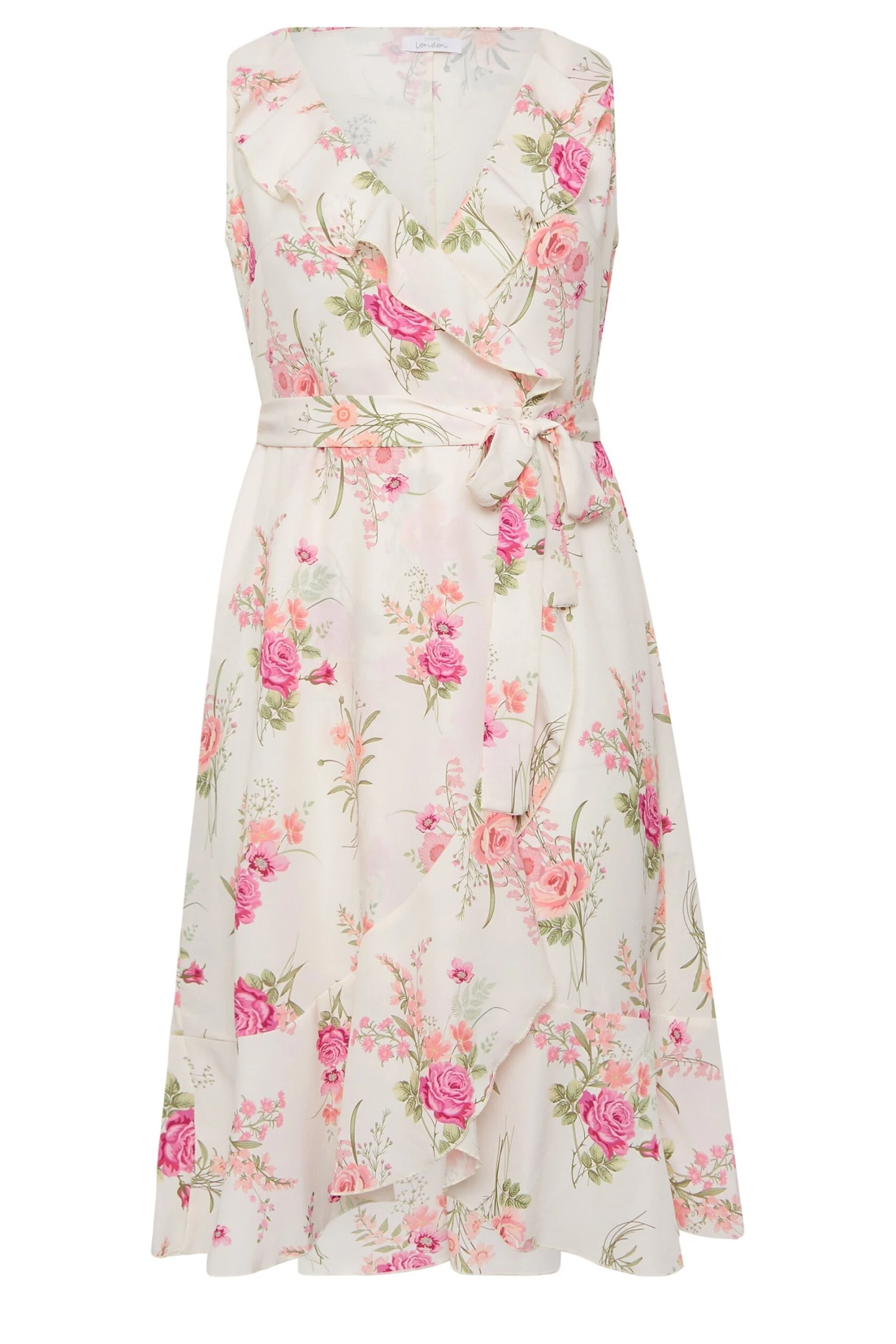Get wedding guest ready in this new-in wrap dress, exclusive to Yours London. Made from a comfortable woven fabric, it features a v-neckline with double ruffle detailing in a sleeveless design, complete at a midi length. Simply style with heels and clutch bag to finish the look.